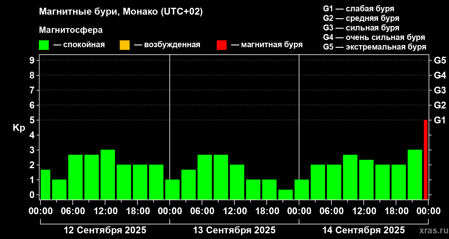 Изменения геомагнитного индекса Kp с 12 по 14 сентября 2025 года для средних широт