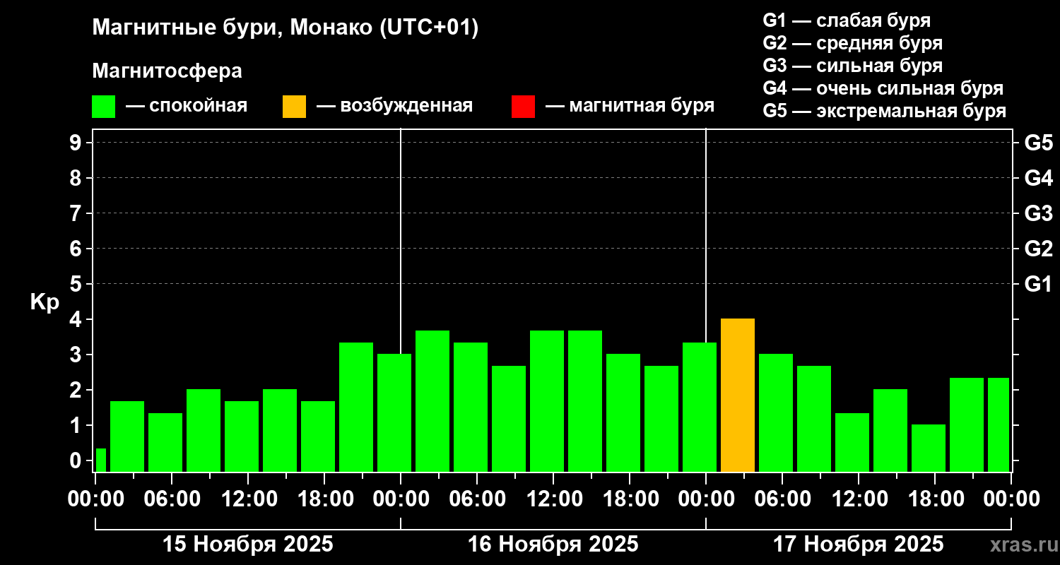 Изменения геомагнитного индекса Kp с 15 по 17 ноября 2025 года для средних широт