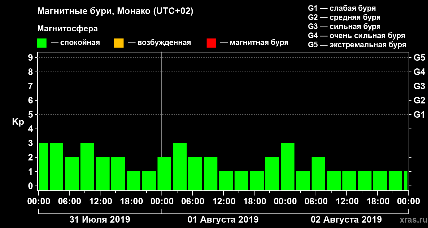 Изменения геомагнитного индекса Kp с 31 июля по 2 августа 2019 года для средних широт