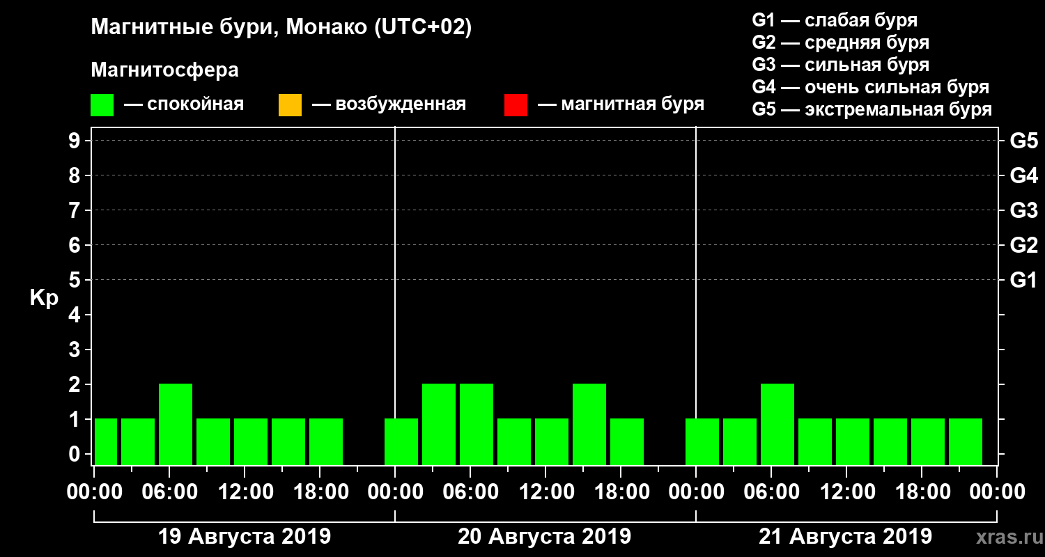 Изменения геомагнитного индекса Kp с 19 по 21 августа 2019 года для средних широт