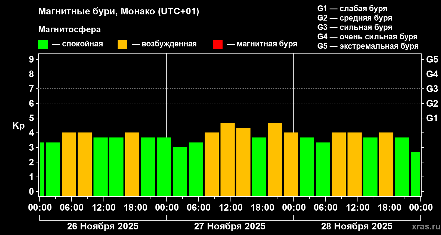 Изменения геомагнитного индекса Kp с 26 по 28 ноября 2025 года для средних широт