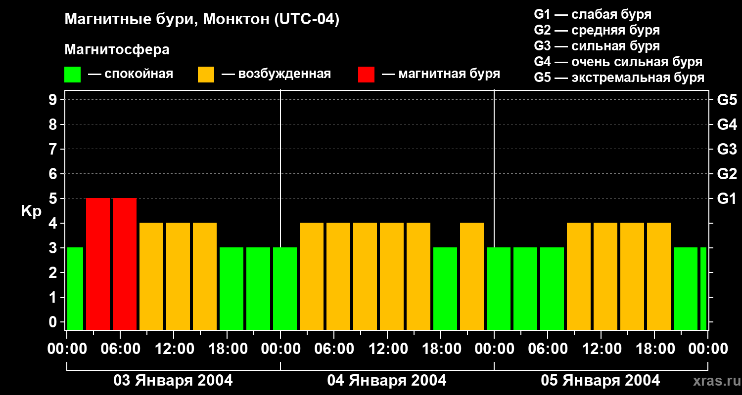 Изменения геомагнитного индекса Kp с 3 по 5 января 2004 года для средних широт