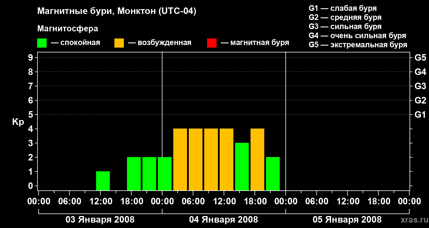 Изменения геомагнитного индекса Kp с 3 по 5 января 2008 года для средних широт
