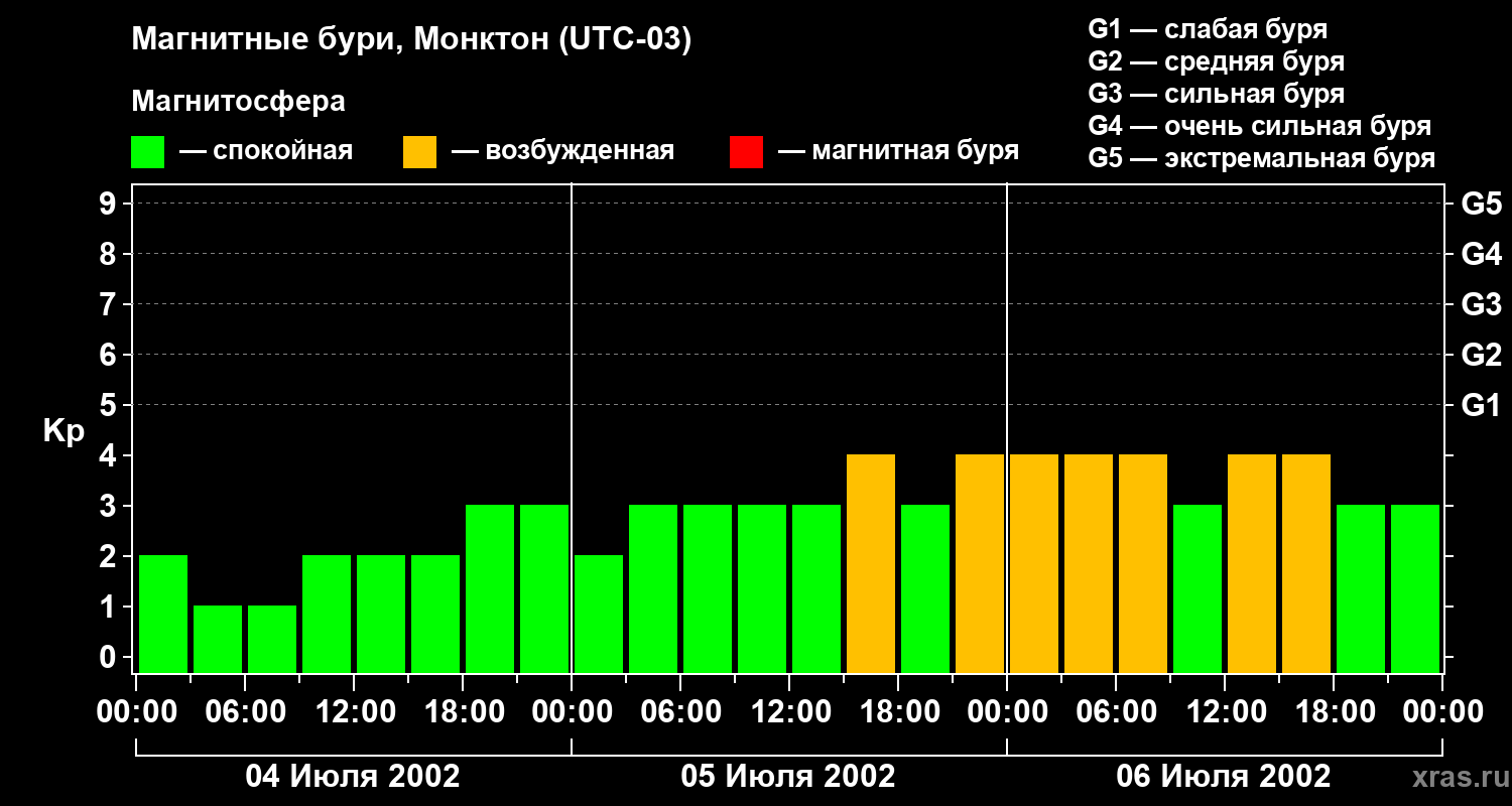 Изменения геомагнитного индекса Kp с 4 по 6 июля 2002 года для средних широт