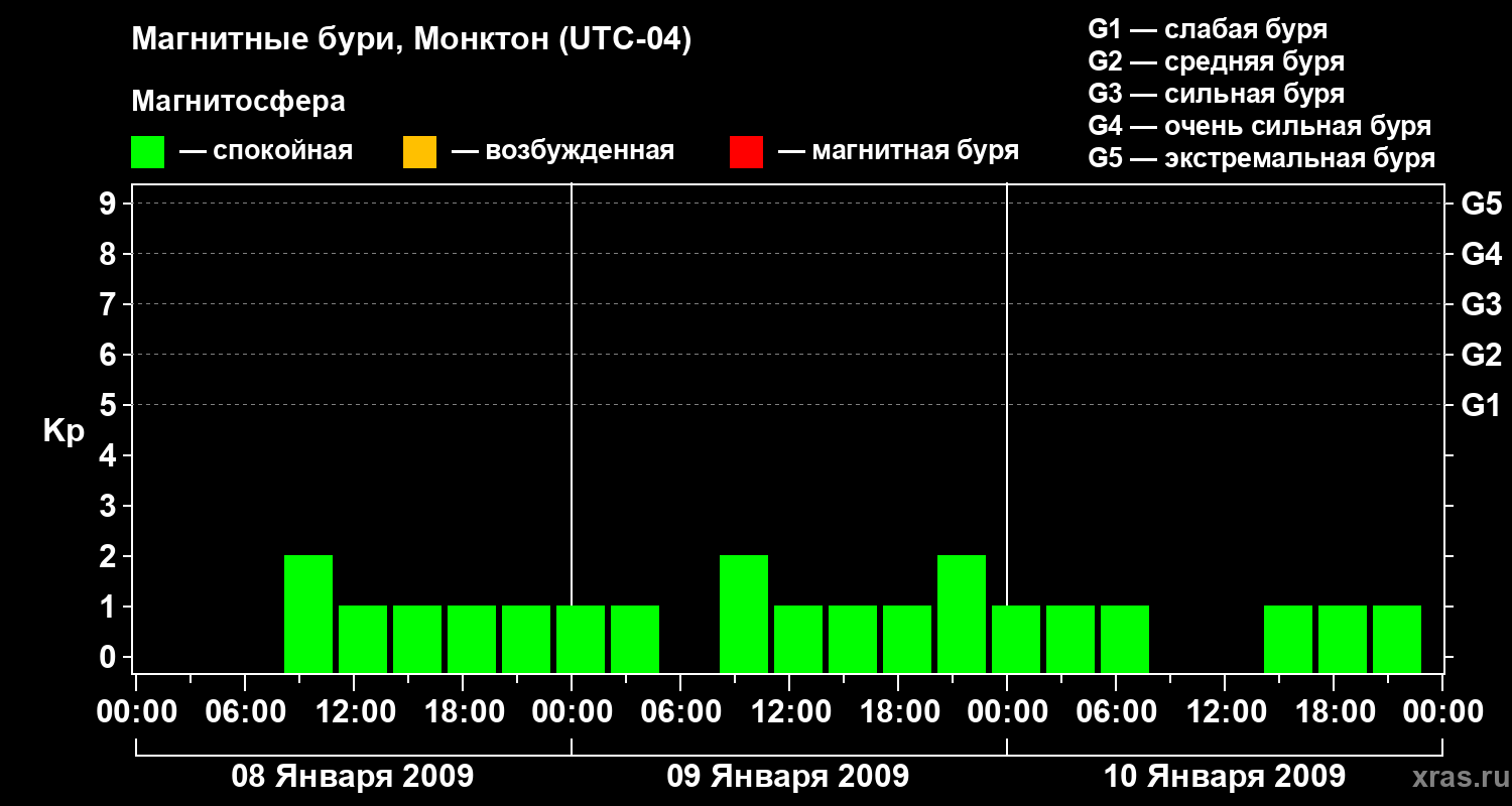 Изменения геомагнитного индекса Kp с 8 по 10 января 2009 года для средних широт