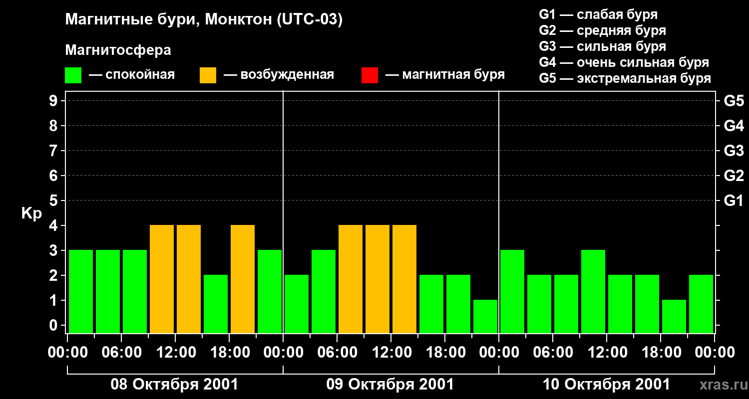 Изменения геомагнитного индекса Kp с 8 по 10 октября 2001 года для средних широт