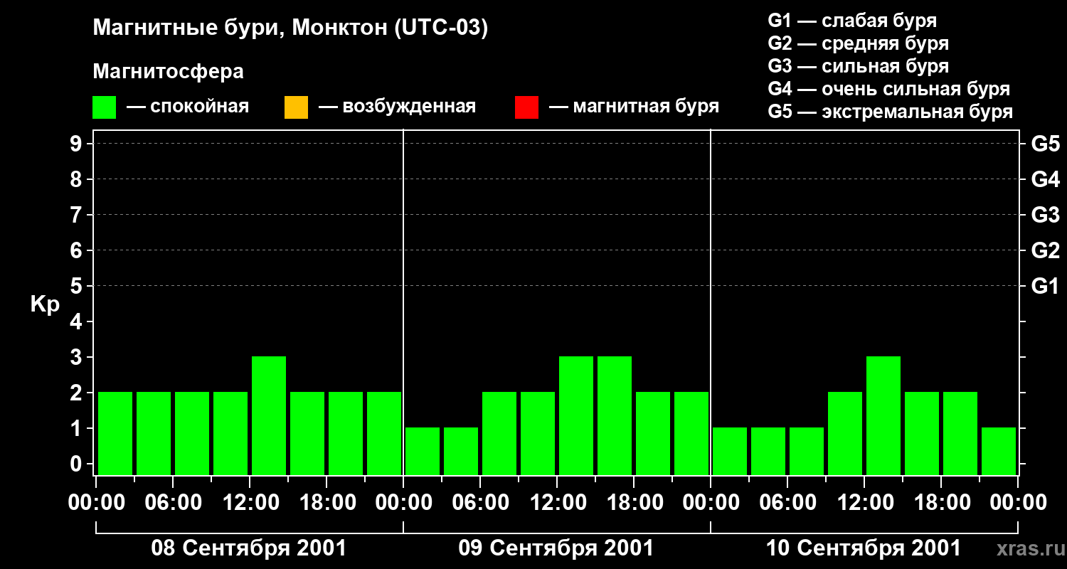 Изменения геомагнитного индекса Kp с 8 по 10 сентября 2001 года для средних широт