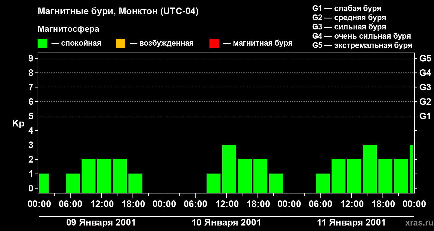 Изменения геомагнитного индекса Kp с 9 по 11 января 2001 года для средних широт