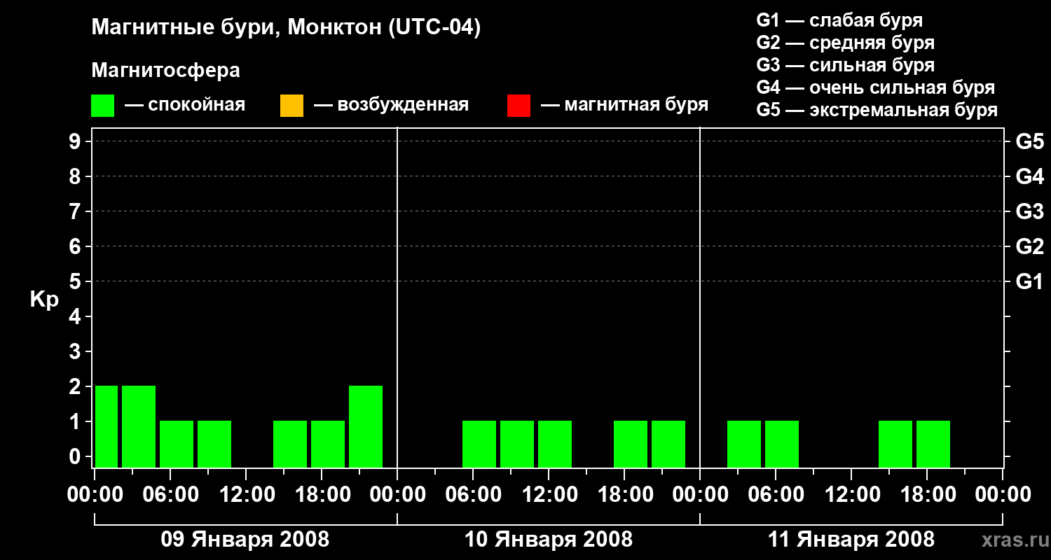 Изменения геомагнитного индекса Kp с 9 по 11 января 2008 года для средних широт