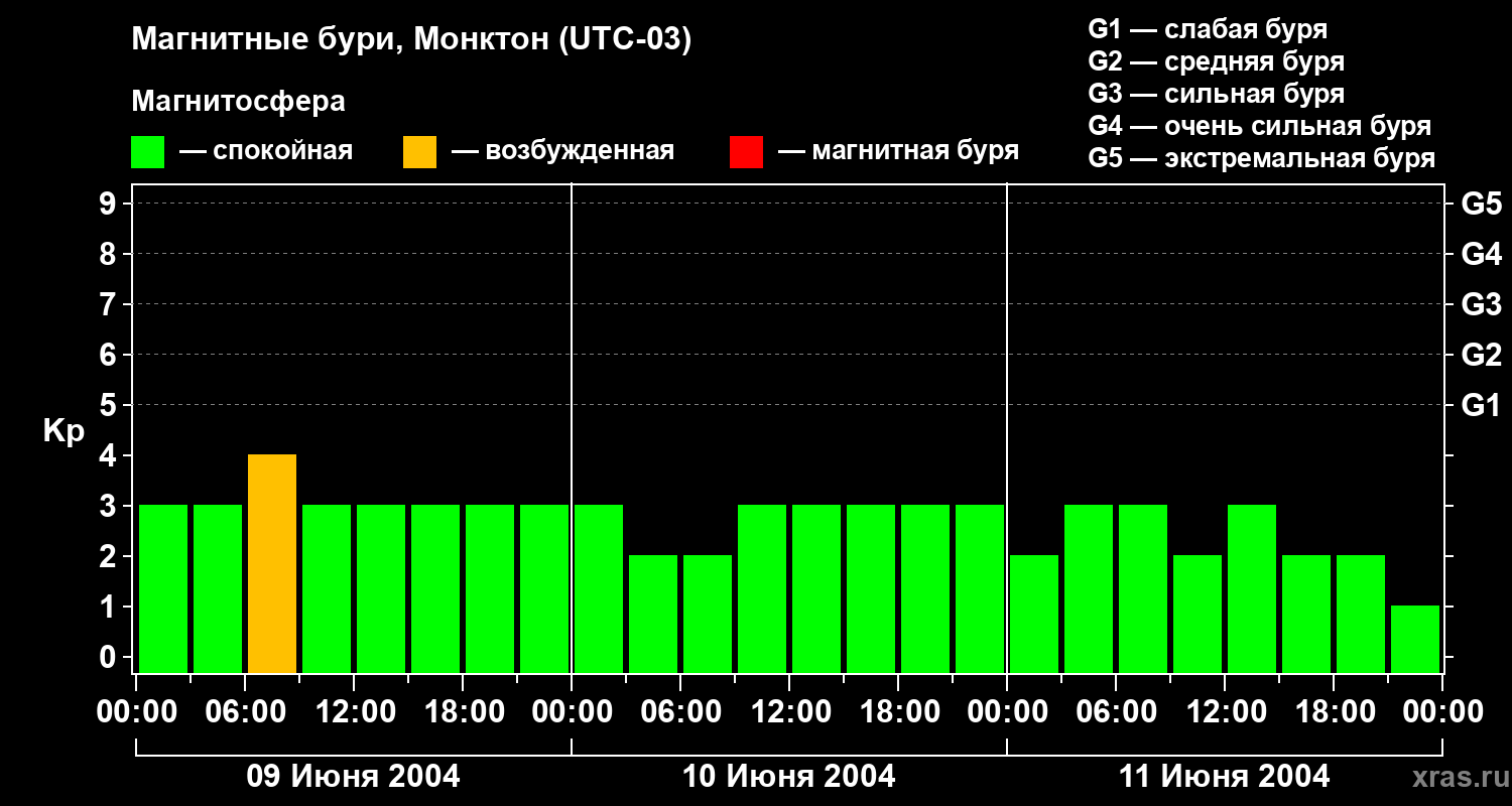Изменения геомагнитного индекса Kp с 9 по 11 июня 2004 года для средних широт