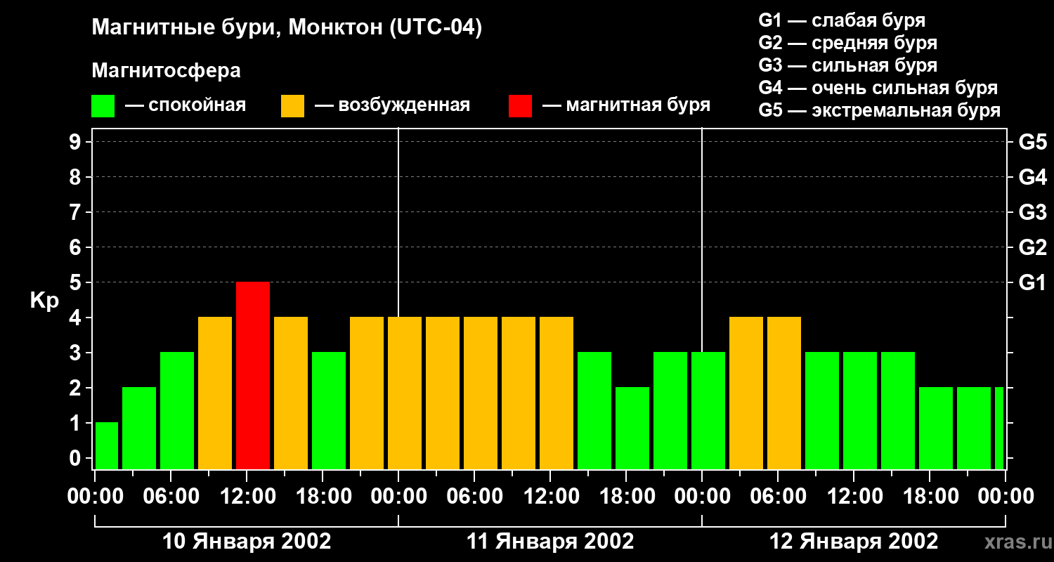 Изменения геомагнитного индекса Kp с 10 по 12 января 2002 года для средних широт