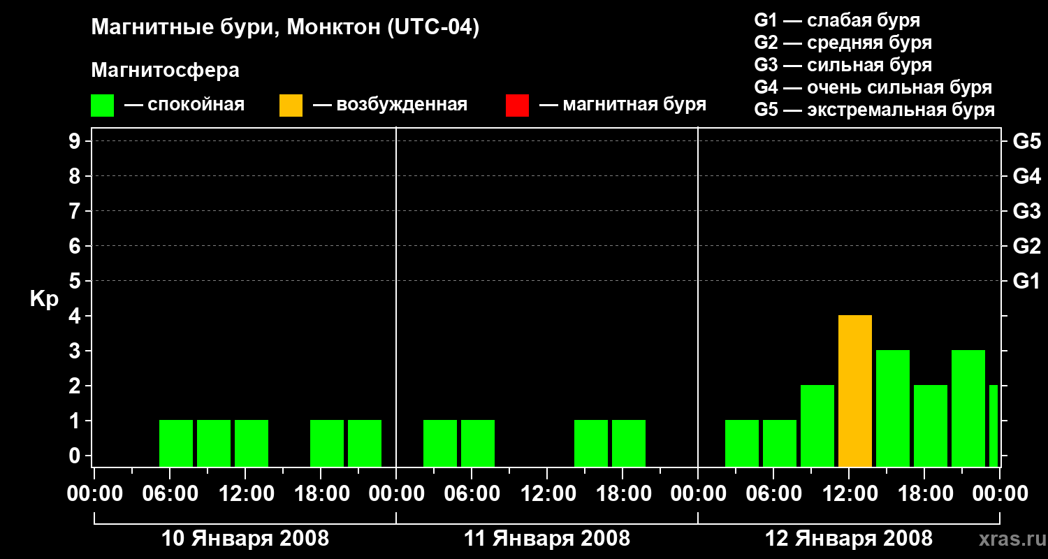 Изменения геомагнитного индекса Kp с 10 по 12 января 2008 года для средних широт