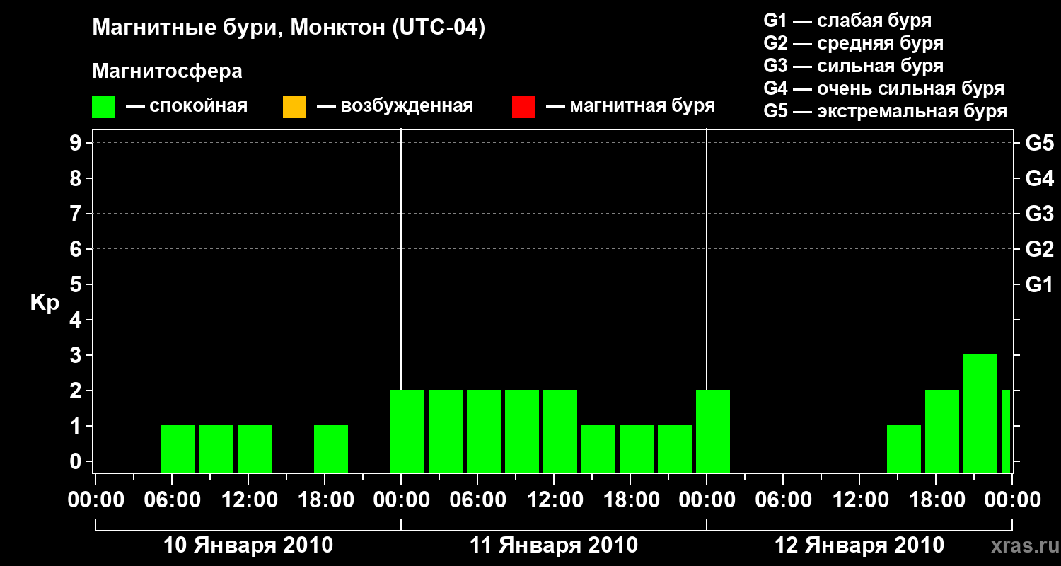 Изменения геомагнитного индекса Kp с 10 по 12 января 2010 года для средних широт
