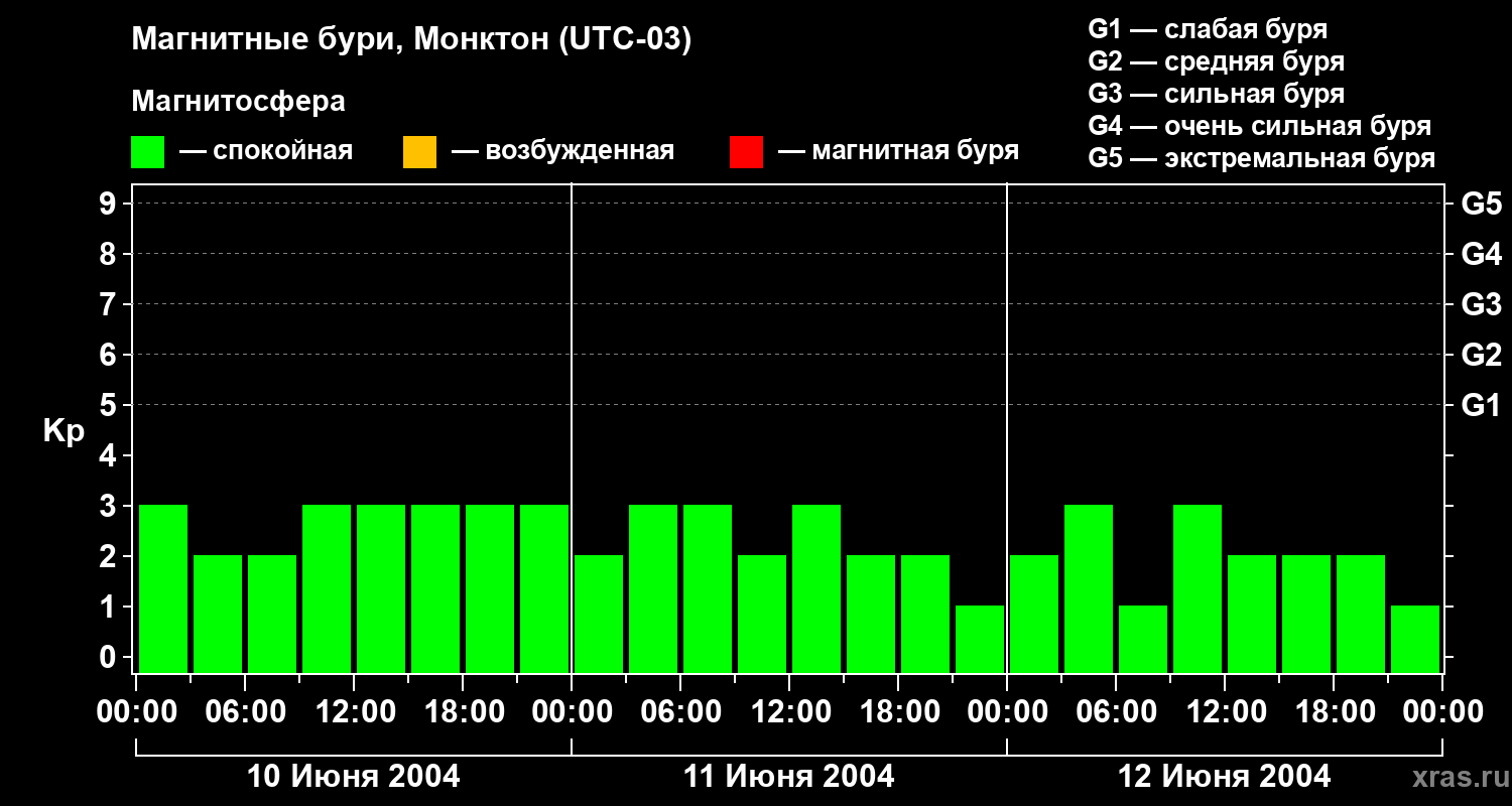 Изменения геомагнитного индекса Kp с 10 по 12 июня 2004 года для средних широт