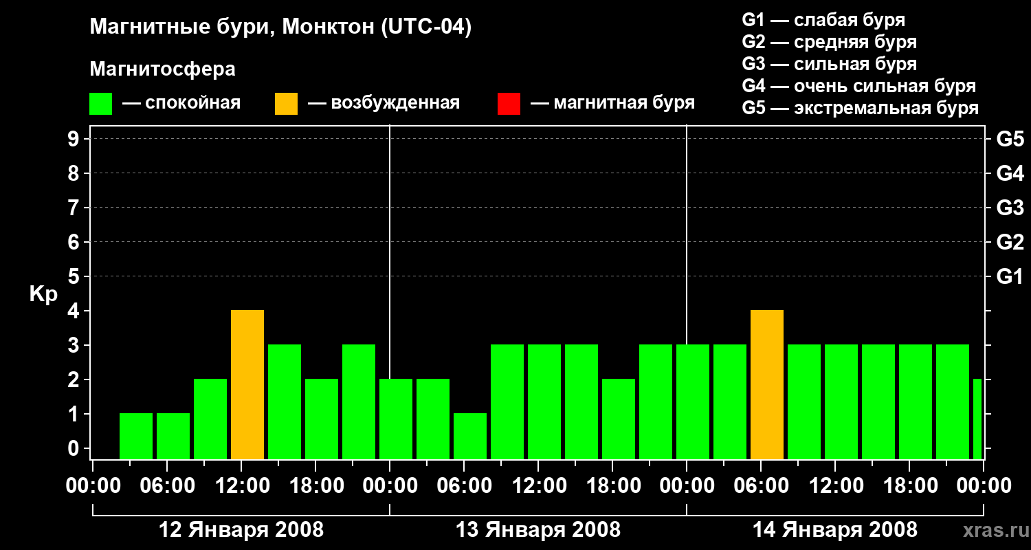 Изменения геомагнитного индекса Kp с 12 по 14 января 2008 года для средних широт