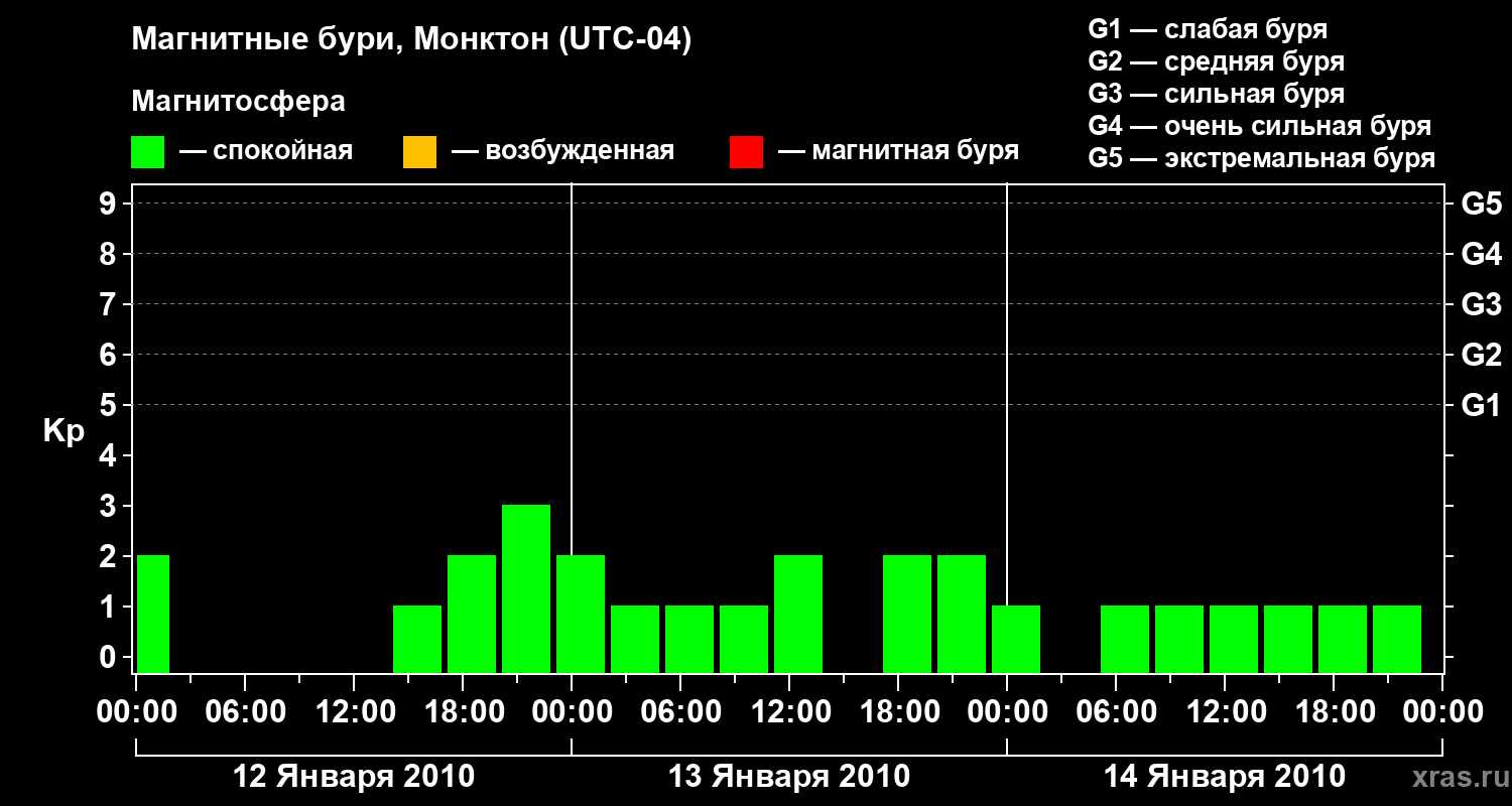 Изменения геомагнитного индекса Kp с 12 по 14 января 2010 года для средних широт