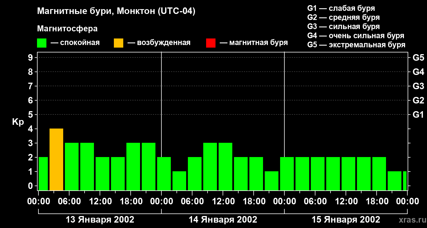 Изменения геомагнитного индекса Kp с 13 по 15 января 2002 года для средних широт