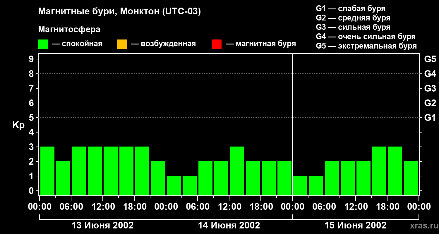 Изменения геомагнитного индекса Kp с 13 по 15 июня 2002 года для средних широт