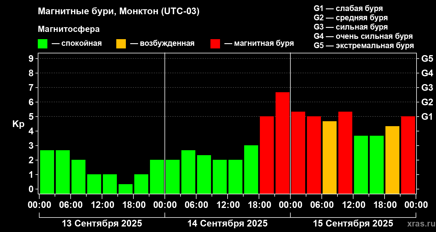 Магнитные бури в Монктоне 15 сентября 2025 года