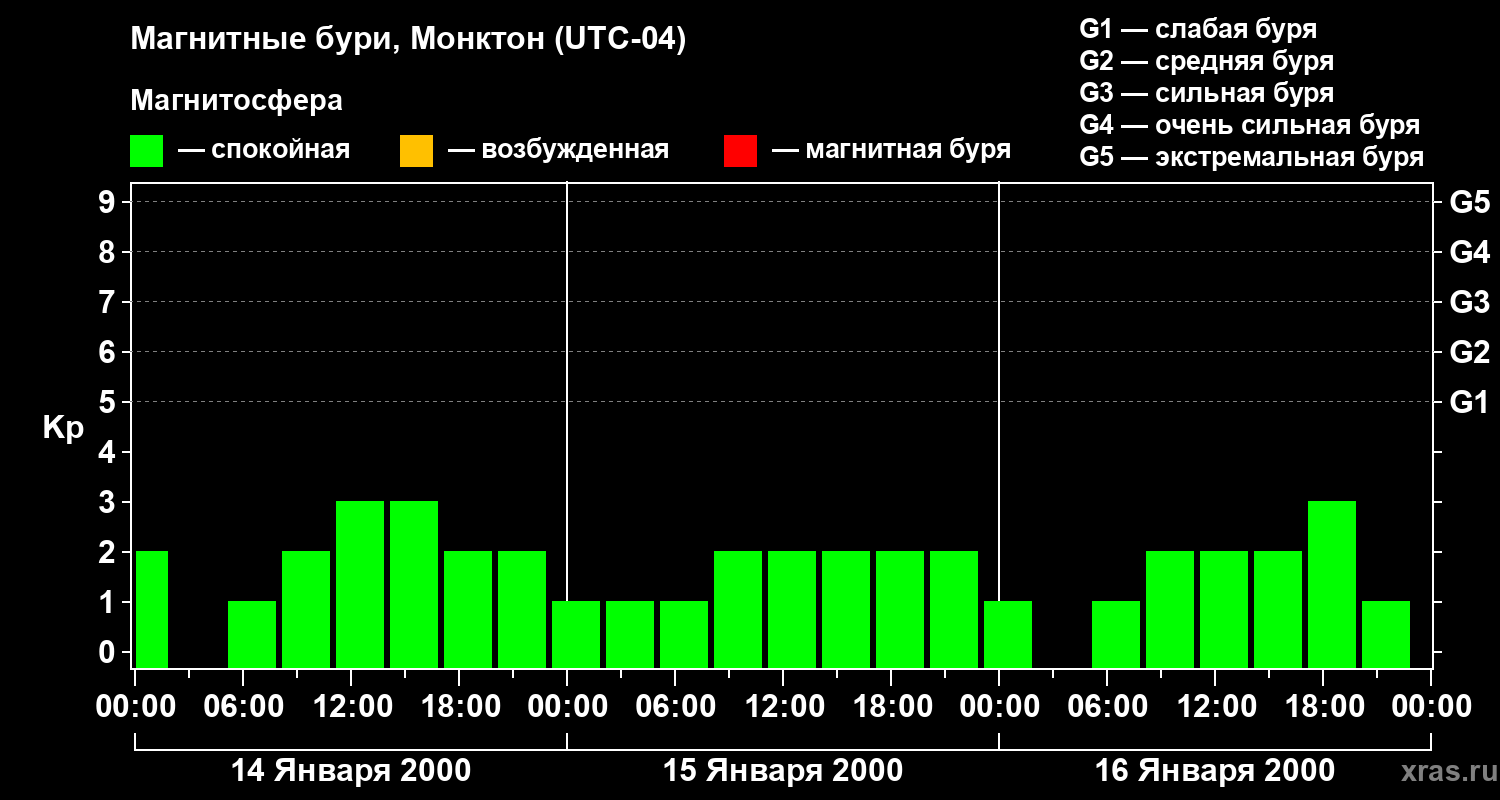 Изменения геомагнитного индекса Kp с 14 по 16 января 2000 года для средних широт