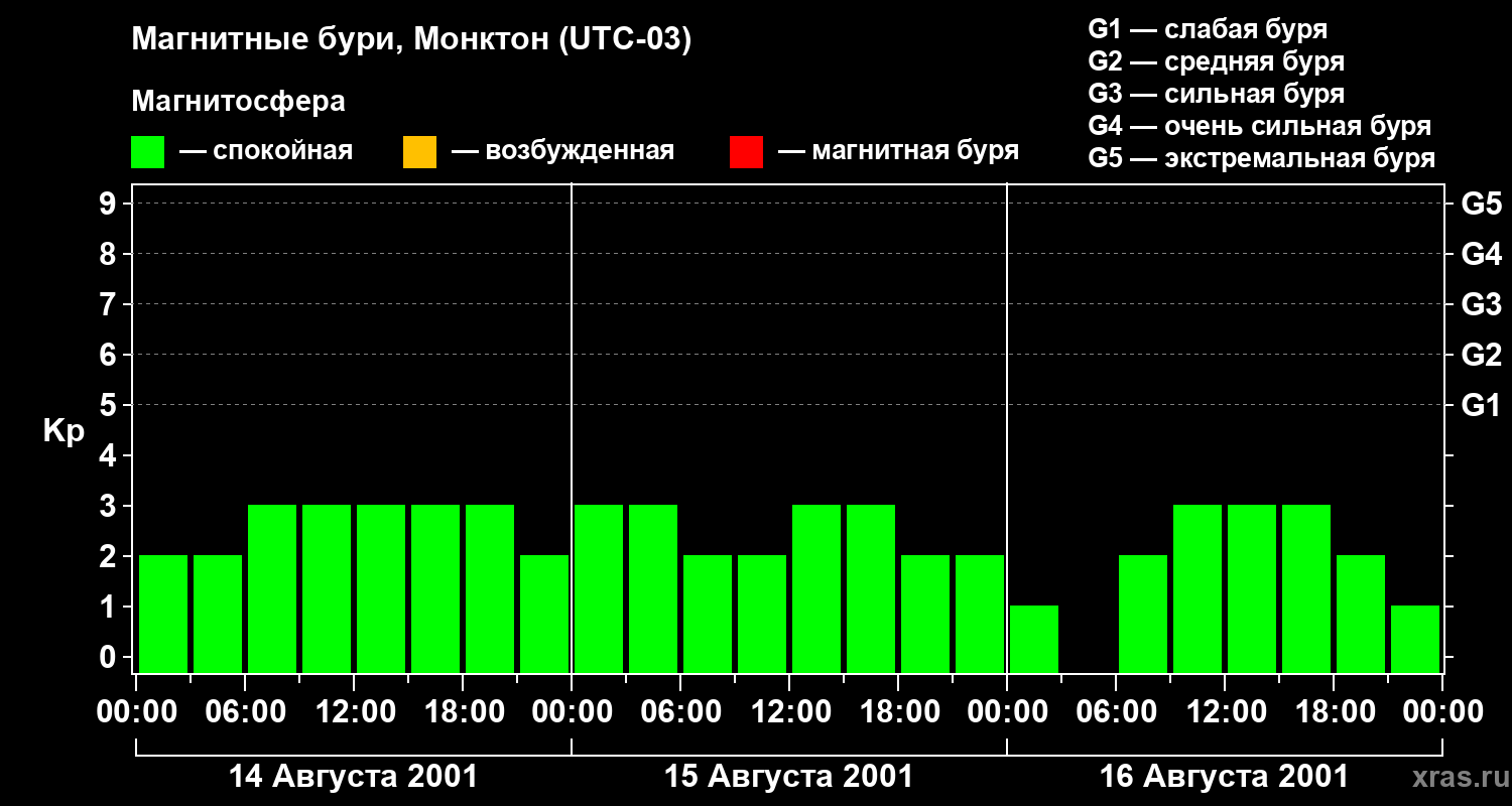 Изменения геомагнитного индекса Kp с 14 по 16 августа 2001 года для средних широт