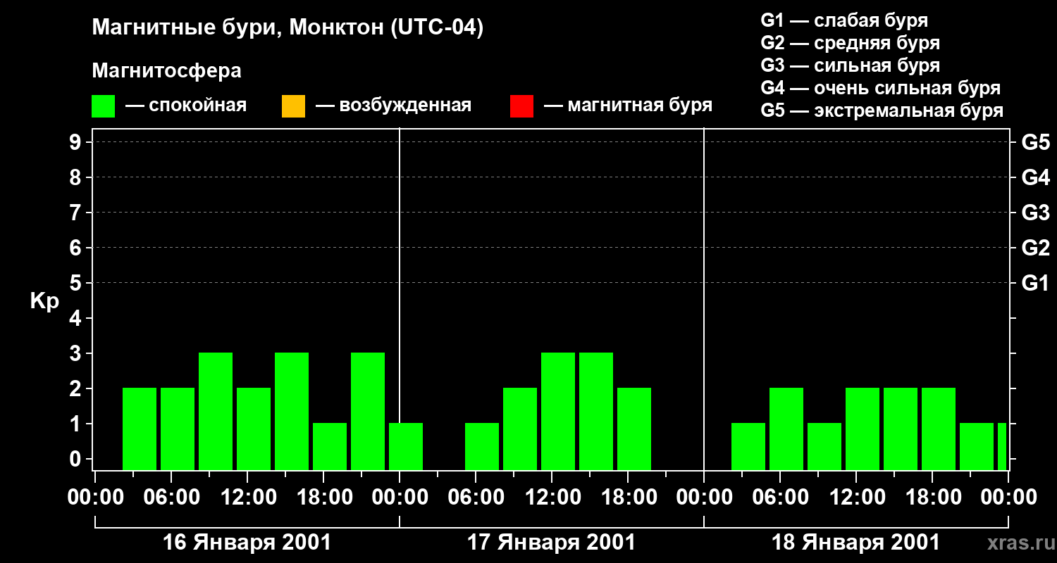 Изменения геомагнитного индекса Kp с 16 по 18 января 2001 года для средних широт