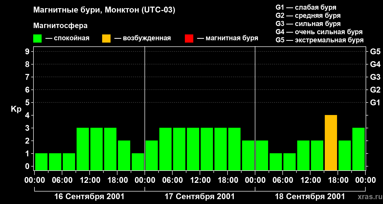 Изменения геомагнитного индекса Kp с 16 по 18 сентября 2001 года для средних широт