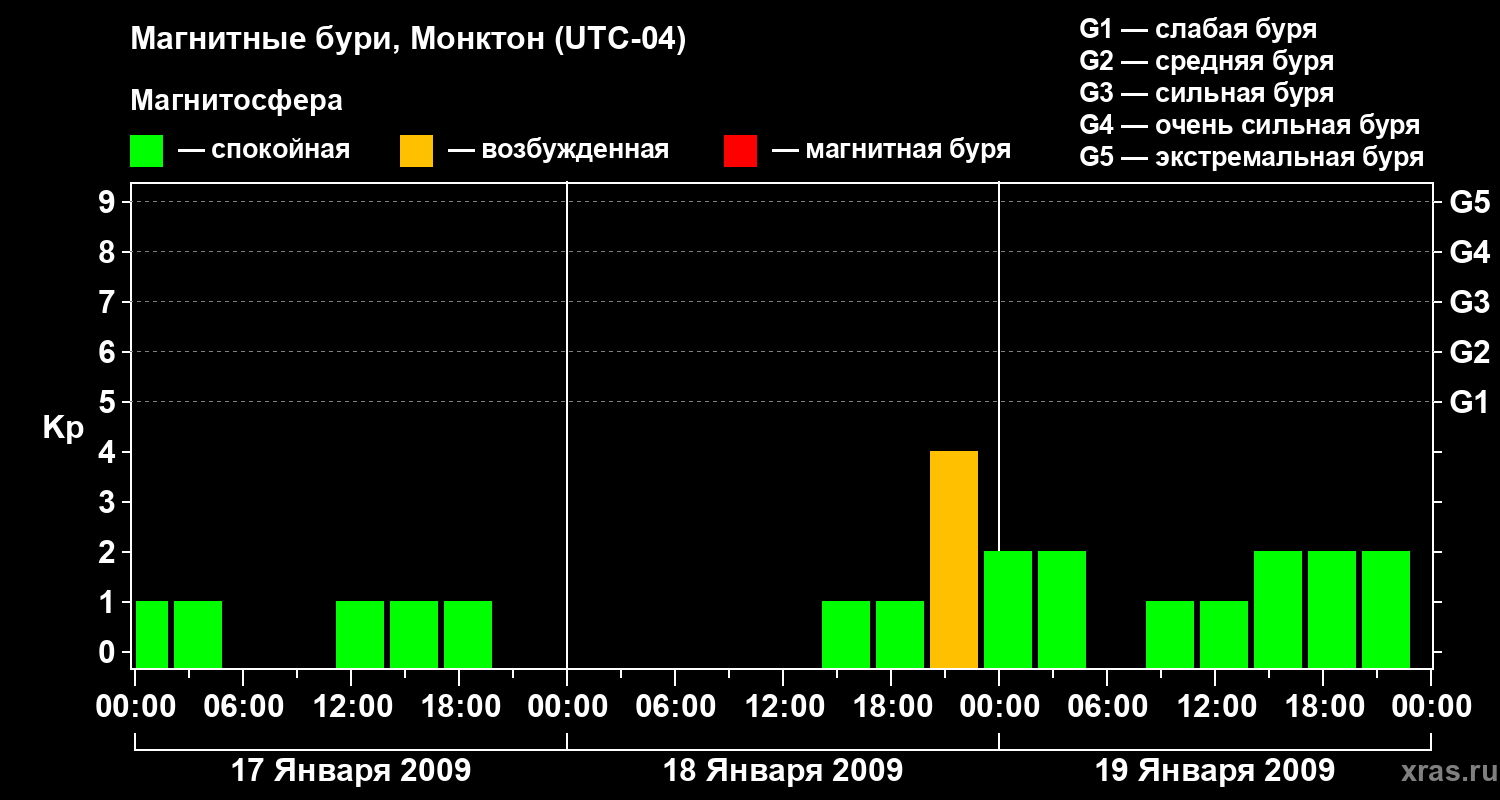 Изменения геомагнитного индекса Kp с 17 по 19 января 2009 года для средних широт