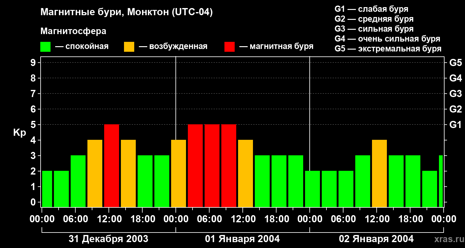 Изменения геомагнитного индекса Kp с 31 декабря 2003 года по 2 января 2004 года для средних широт