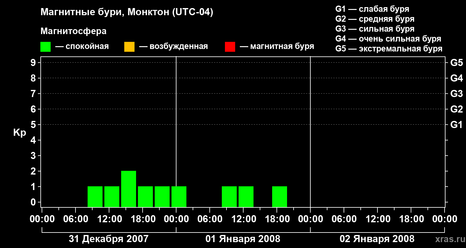 Изменения геомагнитного индекса Kp с 31 декабря 2007 года по 2 января 2008 года для средних широт