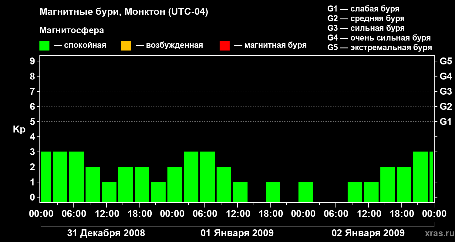 Изменения геомагнитного индекса Kp с 31 декабря 2008 года по 2 января 2009 года для средних широт