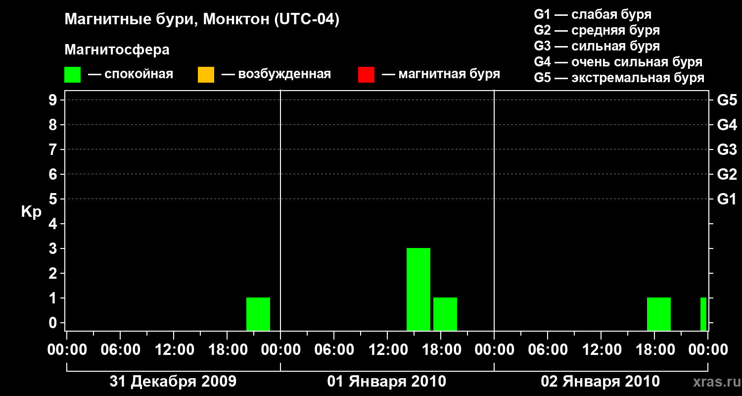 Изменения геомагнитного индекса Kp с 31 декабря 2009 года по 2 января 2010 года для средних широт