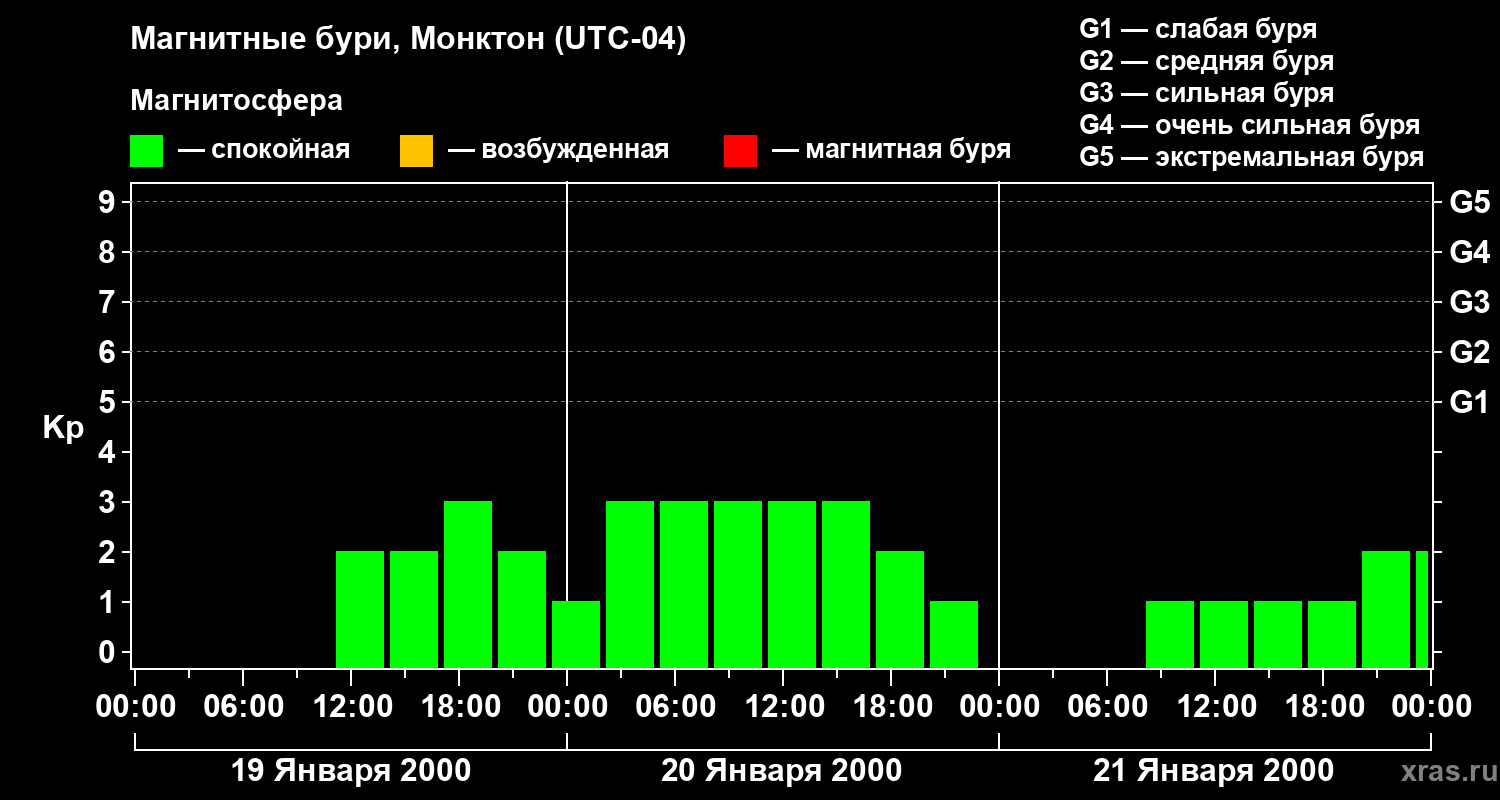 Изменения геомагнитного индекса Kp с 19 по 21 января 2000 года для средних широт