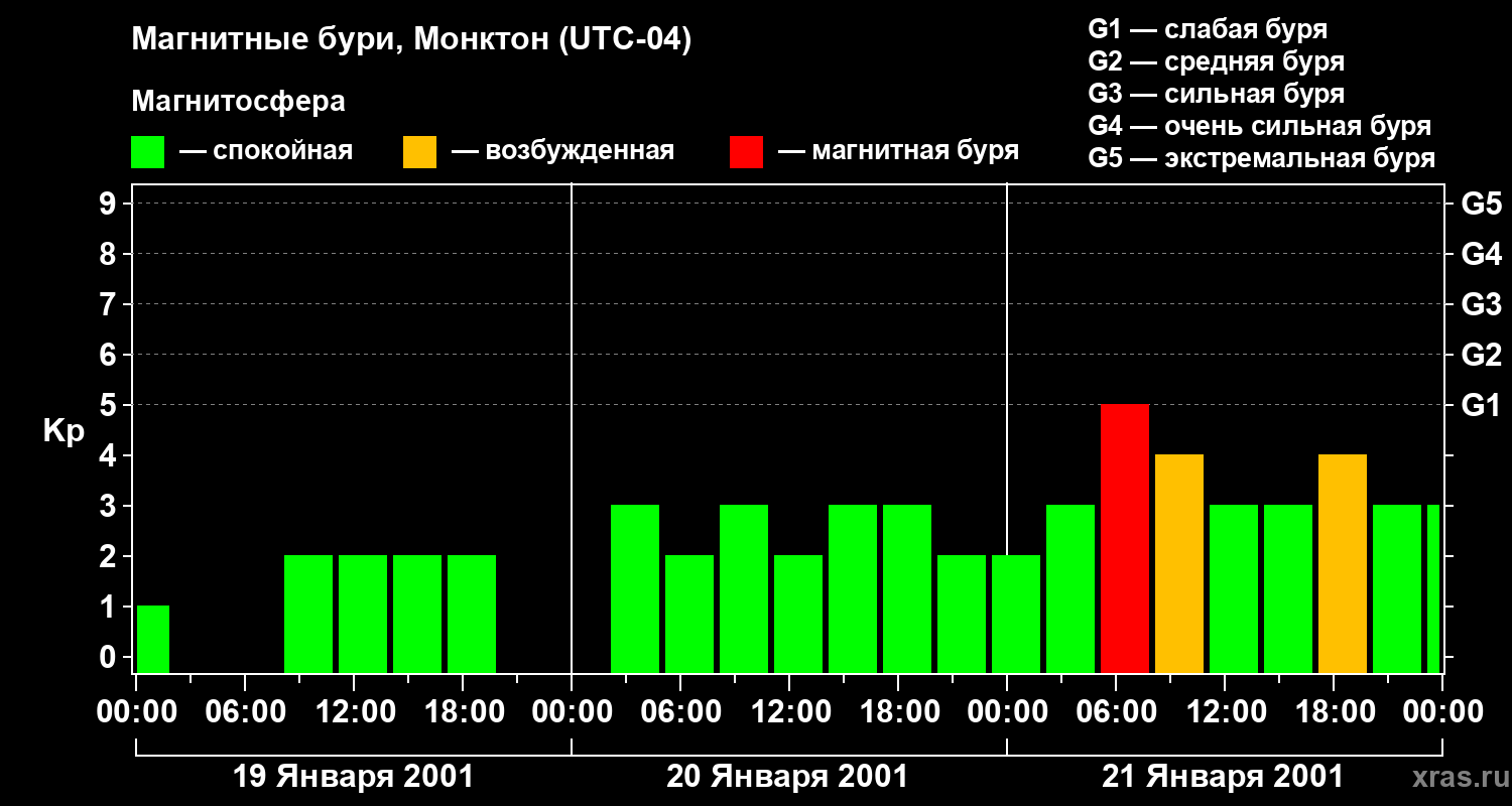 Изменения геомагнитного индекса Kp с 19 по 21 января 2001 года для средних широт