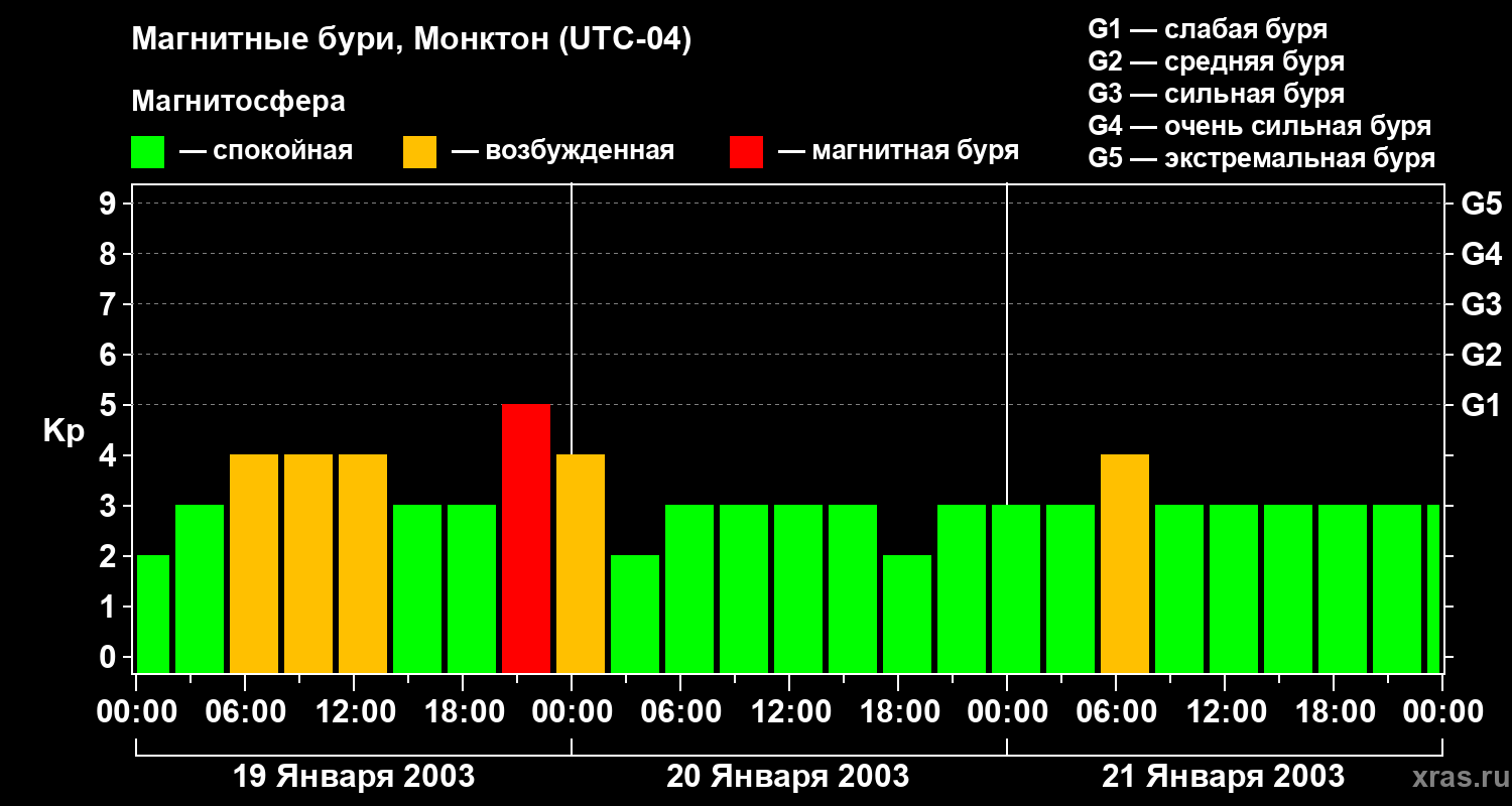 Изменения геомагнитного индекса Kp с 19 по 21 января 2003 года для средних широт