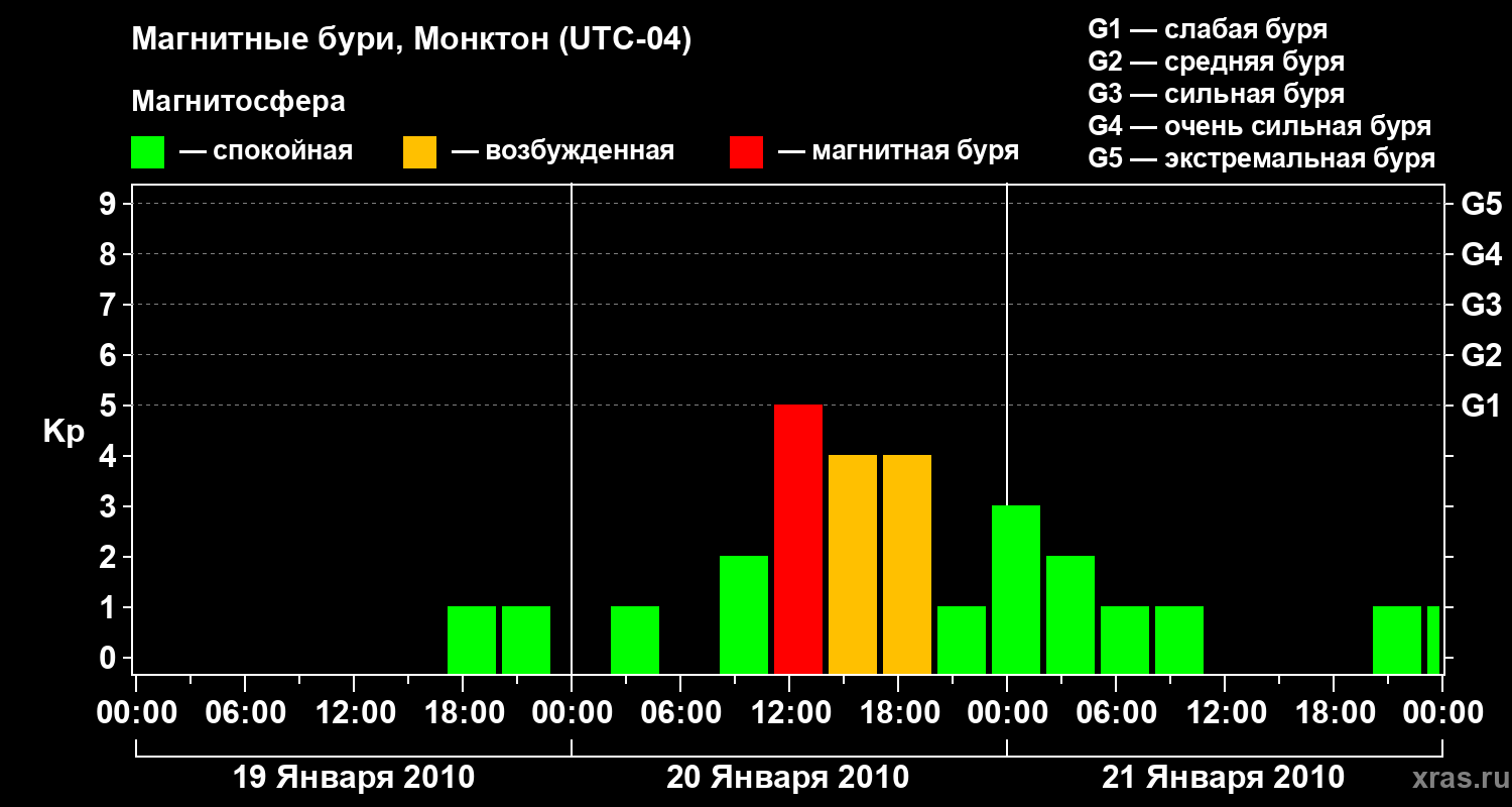 Изменения геомагнитного индекса Kp с 19 по 21 января 2010 года для средних широт