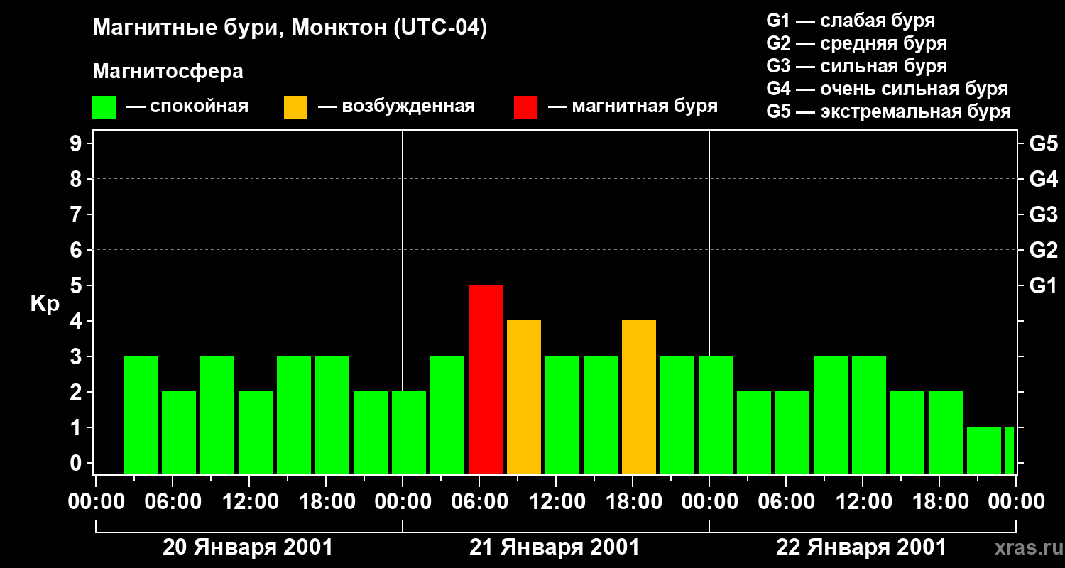 Изменения геомагнитного индекса Kp с 20 по 22 января 2001 года для средних широт