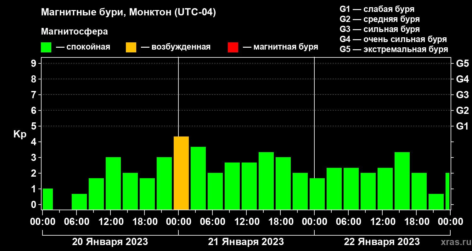 Изменения геомагнитного индекса Kp с 20 по 22 января 2023 года для средних широт
