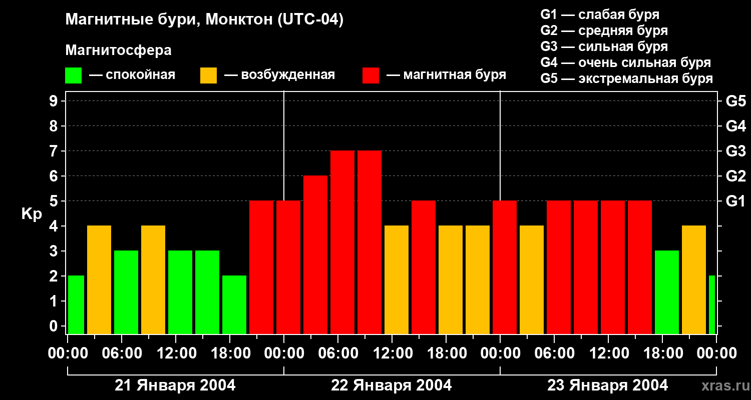 Изменения геомагнитного индекса Kp с 21 по 23 января 2004 года для средних широт