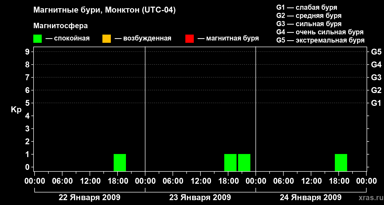 Изменения геомагнитного индекса Kp с 22 по 24 января 2009 года для средних широт