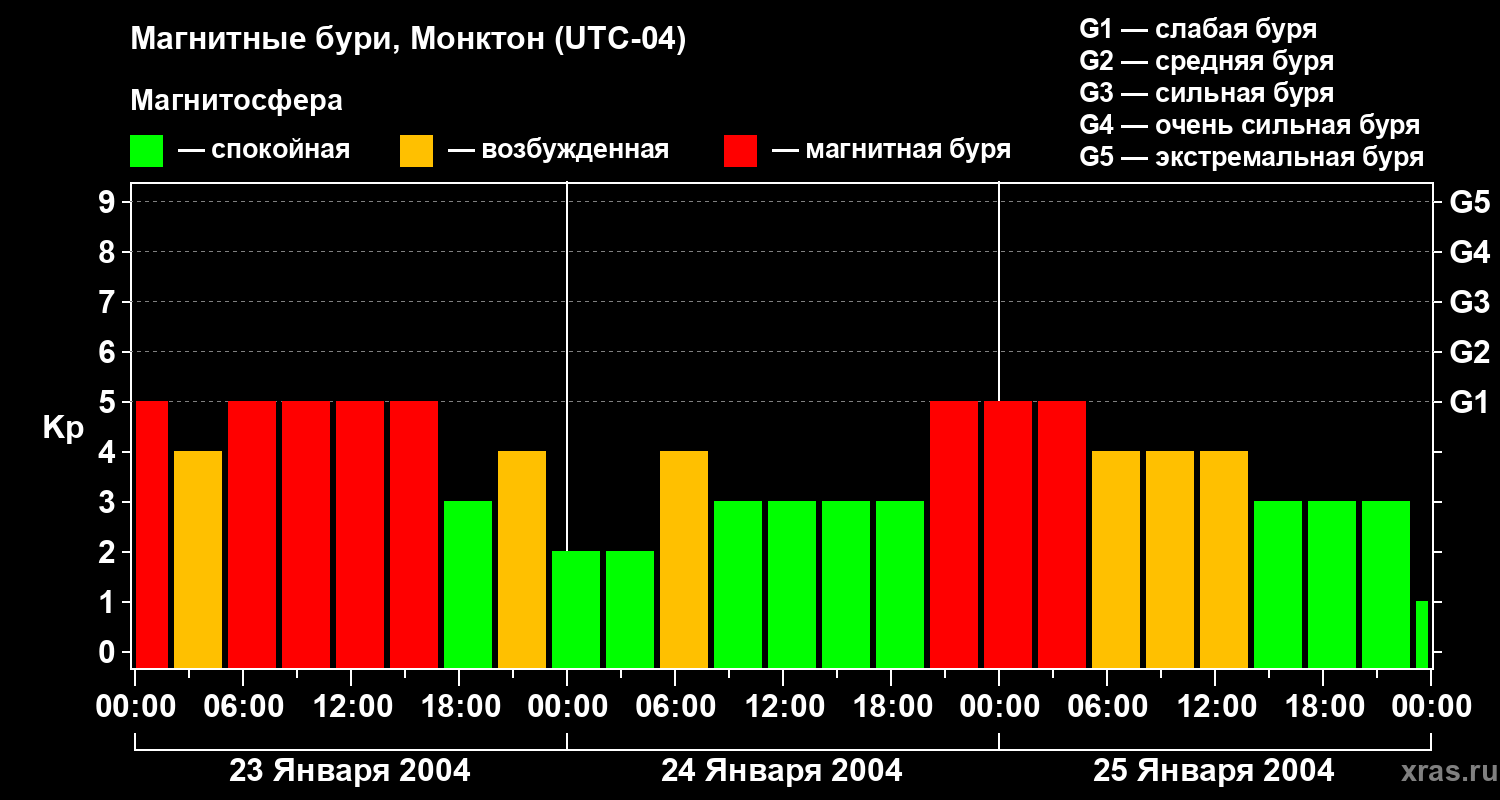 Изменения геомагнитного индекса Kp с 23 по 25 января 2004 года для средних широт