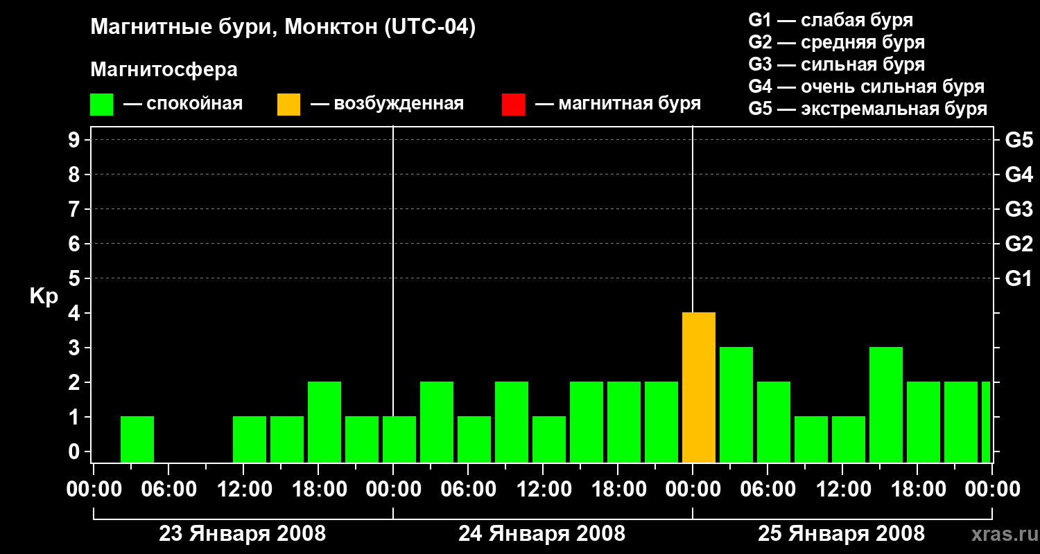 Изменения геомагнитного индекса Kp с 23 по 25 января 2008 года для средних широт