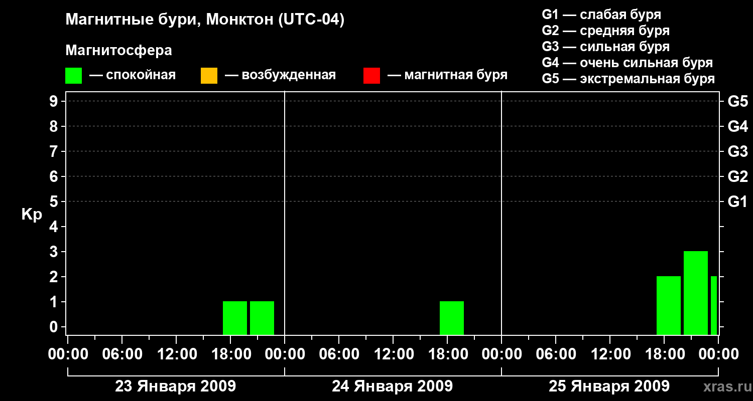Изменения геомагнитного индекса Kp с 23 по 25 января 2009 года для средних широт