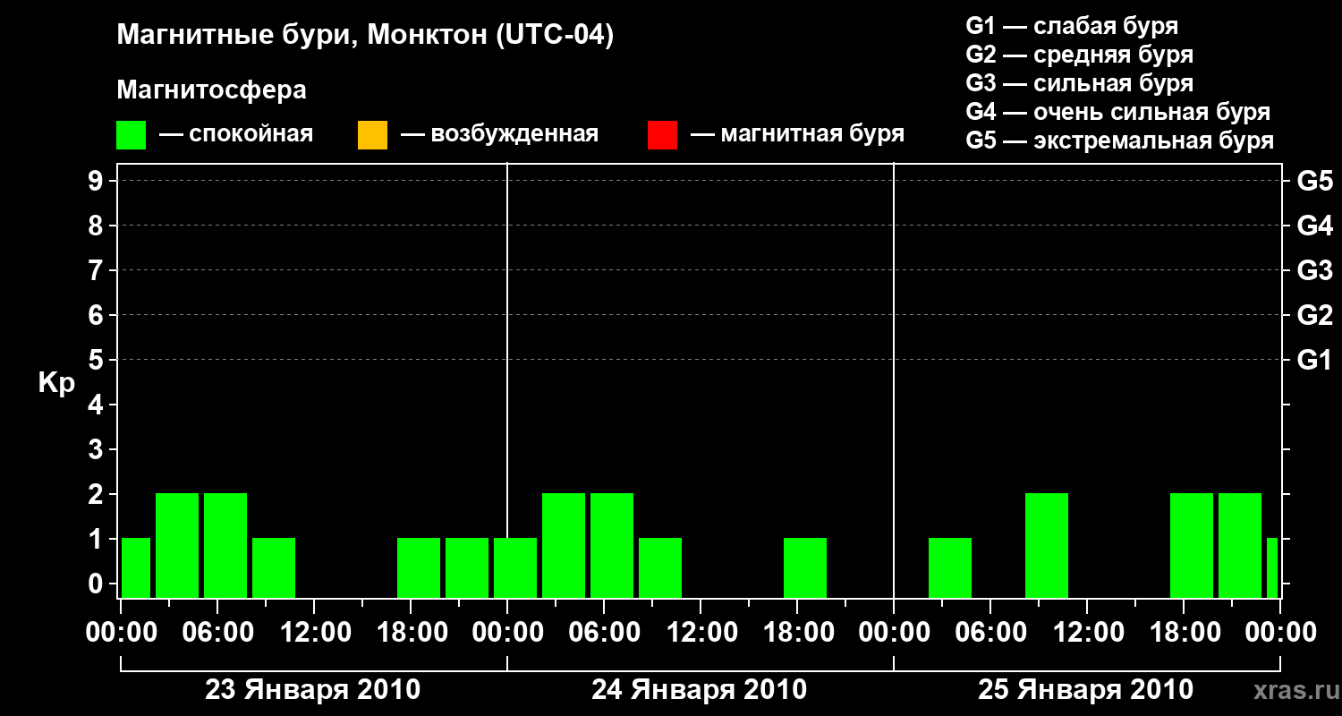 Изменения геомагнитного индекса Kp с 23 по 25 января 2010 года для средних широт