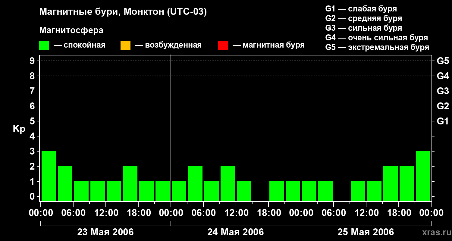 Изменения геомагнитного индекса Kp с 23 по 25 мая 2006 года для средних широт