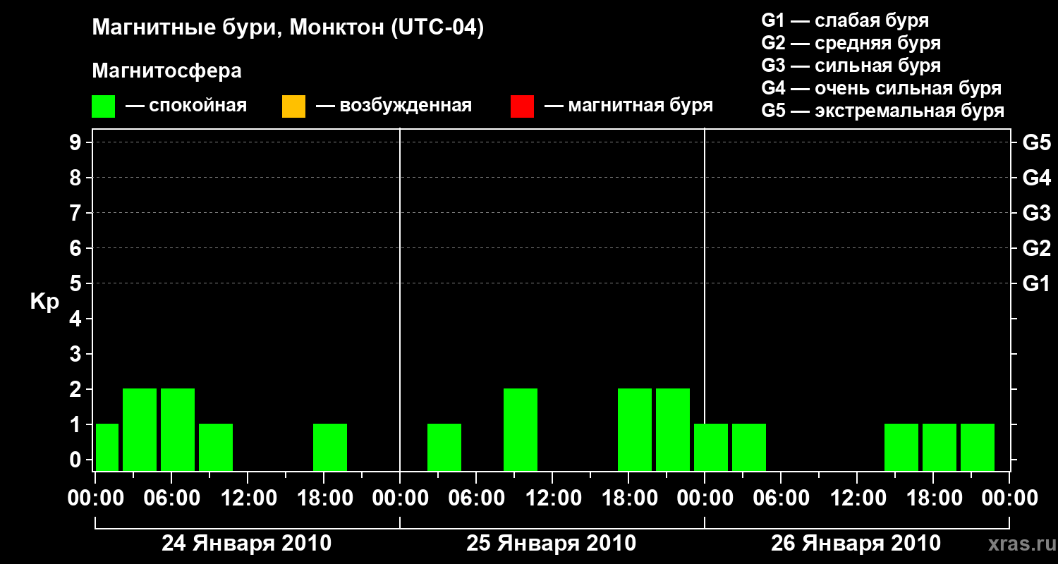 Изменения геомагнитного индекса Kp с 24 по 26 января 2010 года для средних широт