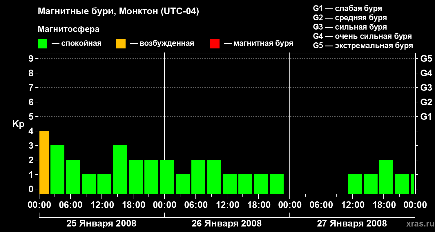 Изменения геомагнитного индекса Kp с 25 по 27 января 2008 года для средних широт