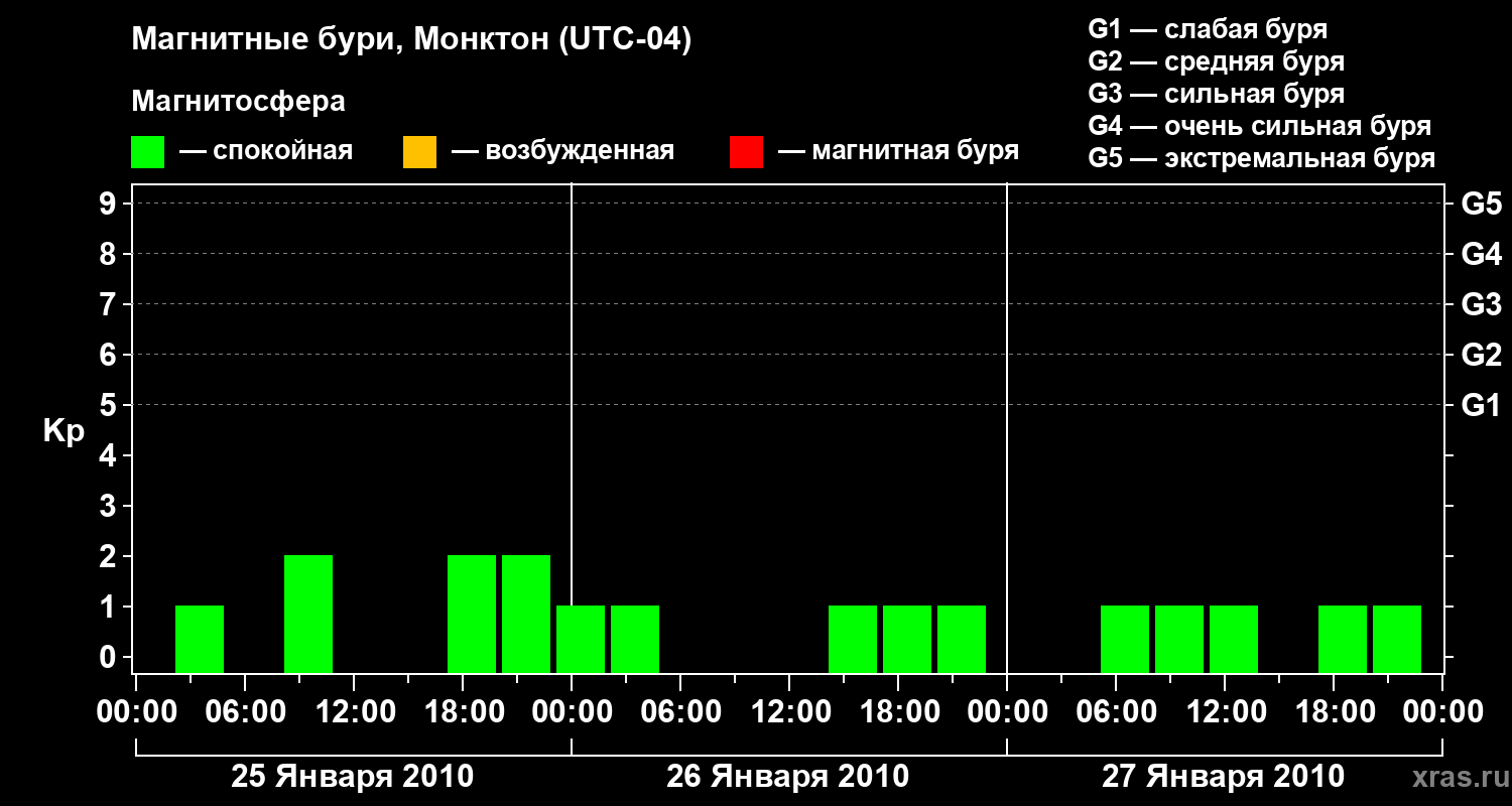 Изменения геомагнитного индекса Kp с 25 по 27 января 2010 года для средних широт
