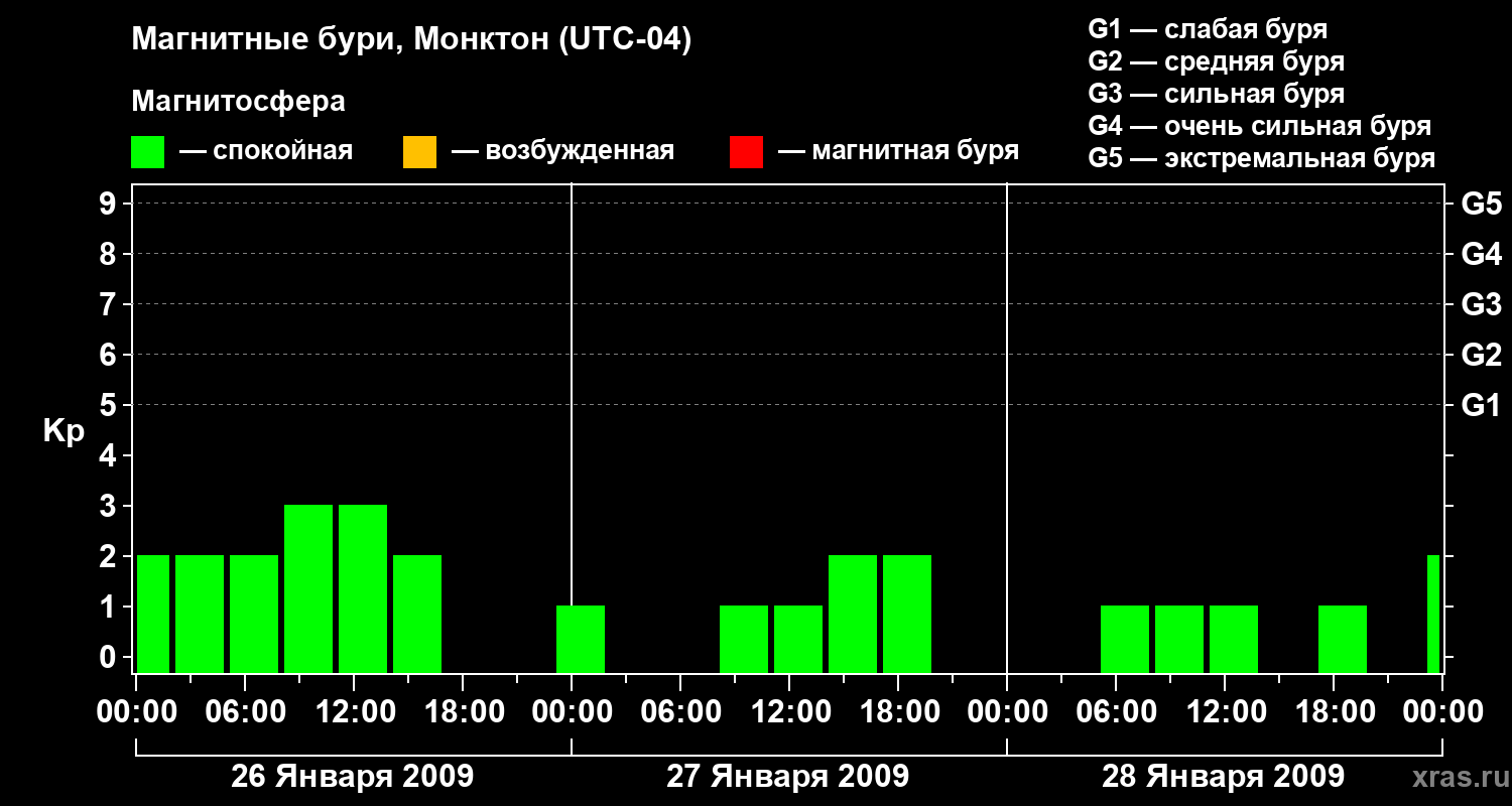 Изменения геомагнитного индекса Kp с 26 по 28 января 2009 года для средних широт