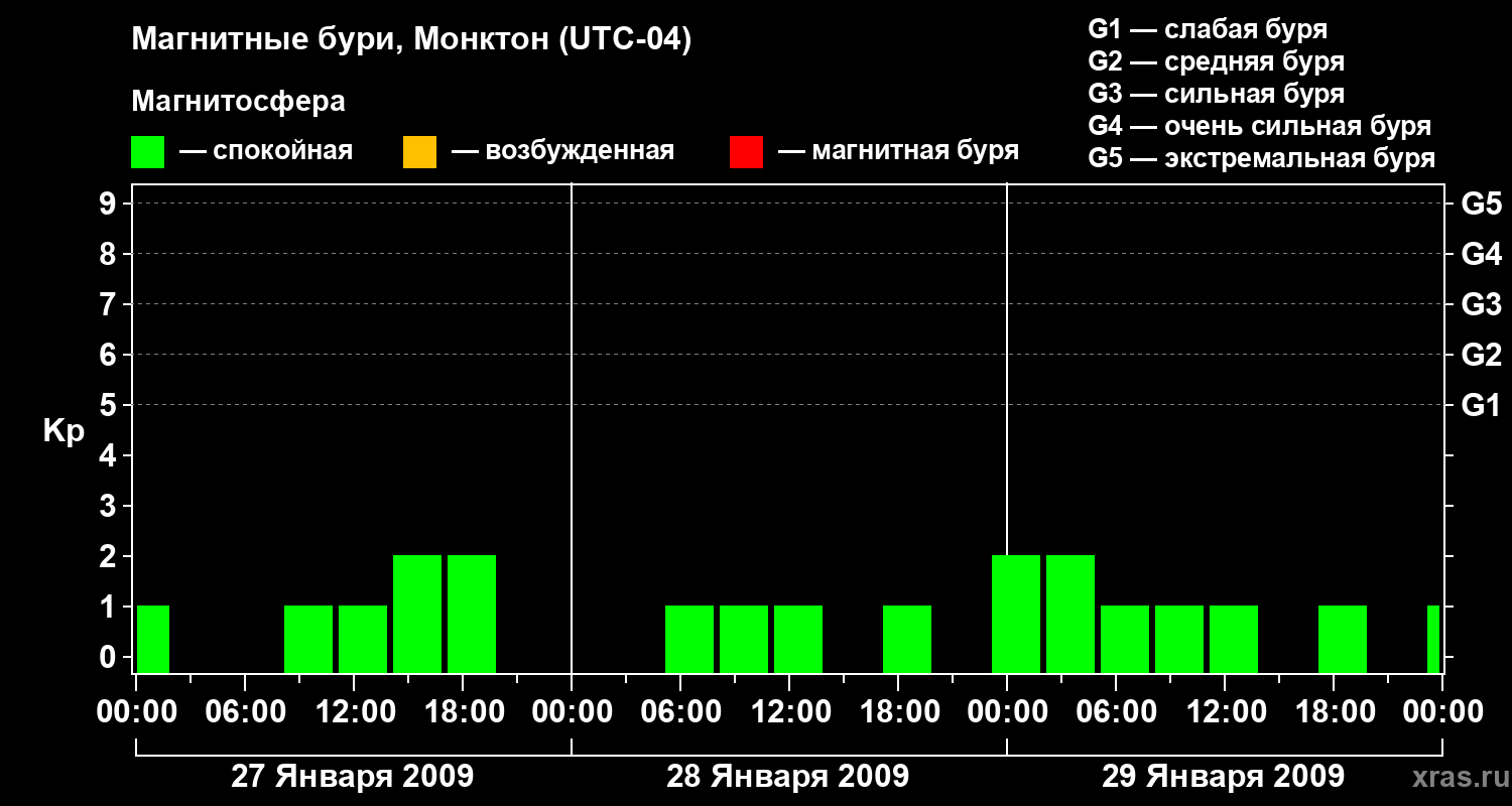 Изменения геомагнитного индекса Kp с 27 по 29 января 2009 года для средних широт